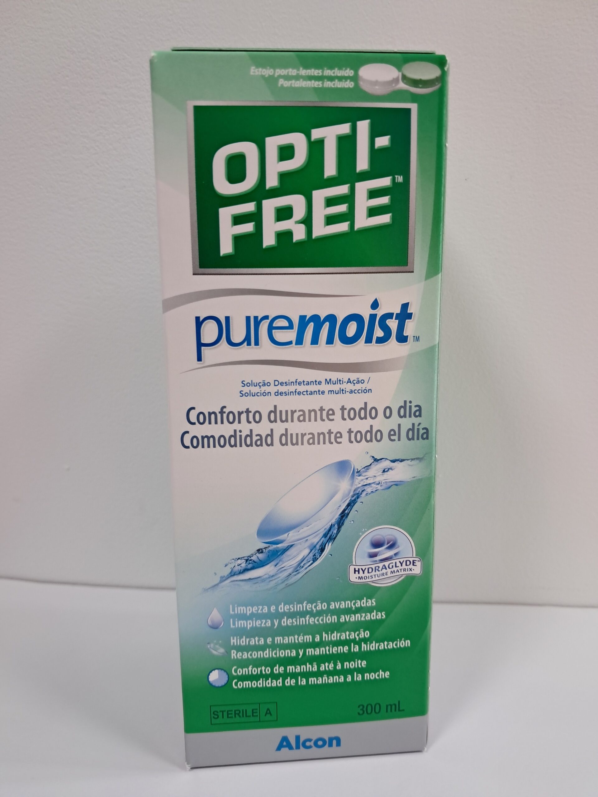 Uma solução desinfetante multi-ação com a Matriz Humectante HydraGlyde® que limpa, hidrata, enxagua, desinfeta, remove lípidos e proteínas, e conserva as lentes de contacto hidrófilas, o OPTI-FREE PureMoist foi otimizado para as lentes de contacto de silicone hidrogel.